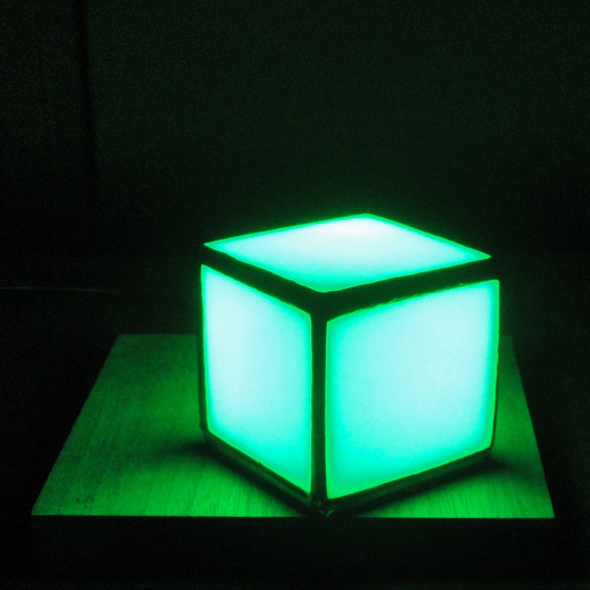 Ganz ohne Kabelverbindung ändert der edle Glas-Würfel seine Farbe mit jeder Verschiebung auf der Grundplatte. Endless Magic!