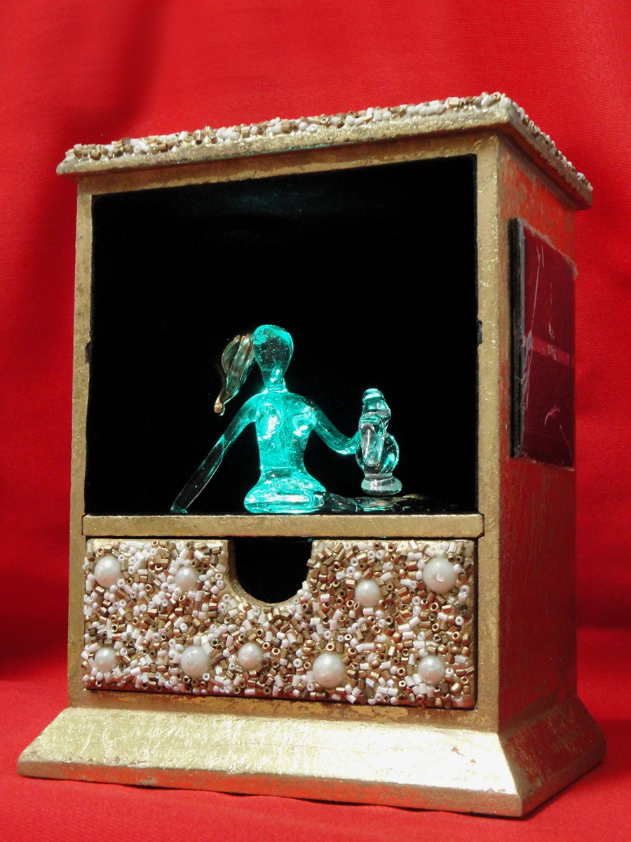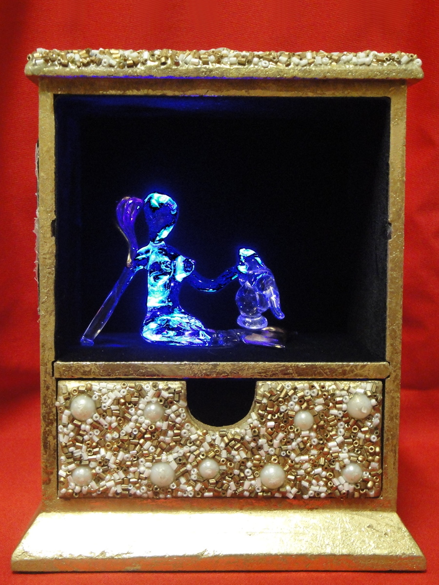 Ihre Unterkunft in Shabby-gold, besetzt mit nobel-schimmernden, halbierten Polypropydings-Perlen, stammt aus Asien und wurde auf ihren Wunsch mit edlem schwarzem Kurzflor-Samt ausgekleidet.